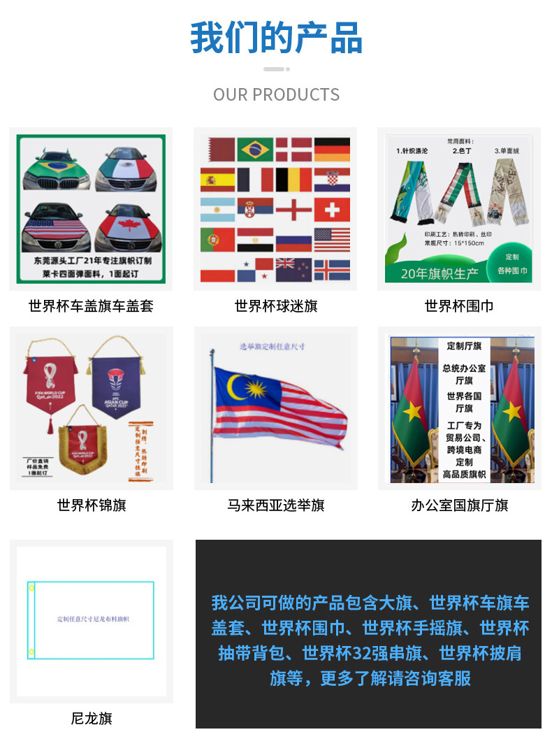 东莞市蕲致工艺品有限公司成立于2010年,专注旗帜研发生产,产品涵盖国旗、赛事旗帜、品牌定制旗、总统竞选旗、围巾旗等全品类,服务覆盖全球40+国家市场。公司日产能达1.5万平米,支持OEM定制,融合自动化机印与手工印染工艺,满足电竞、影视宣传、国际顶级赛事(如世界杯、欧洲联盟杯、亚洲杯)等多元化场景需求。